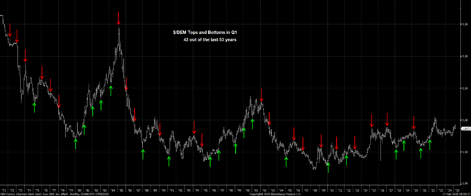 It’s the middle of February again, which means the dollar is on our radar. That’s because since the end of Bretton Woods in the early 1970s, over 80% of the time, the dollar has made its highs or lows for the year vs European FX (in this case, the Deutschemark) in Q1.