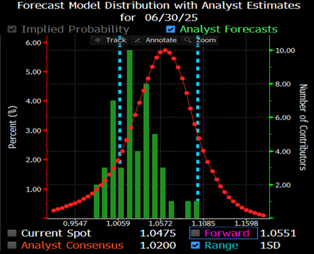 So the obvious question is, are we looking at a high or a low? As we rolled into January, between nascent signs of surging US data and talk of tariffs, 2025 was shaping up to be a strong dollar year. Indeed, as you can see in the graph below, the consensus from the FX analysts is that by the end of June, EURUSD will be 1.0200. Yet, in the last two weeks, we have seen a reversal in this trend. Perhaps it is simply position adjustment in a market late getting into the strong USD trade and now over its risk skis? Don’t forget that the relative sentiment between the US and Europe was extreme at the start of the year (“Europe: Peak Pessimism Creates Opportunity” 6th Feb). If that is the case, then after a correction, the dollar’s dominance will reassert itself, and any current bearish talk is simply narrative fitting.